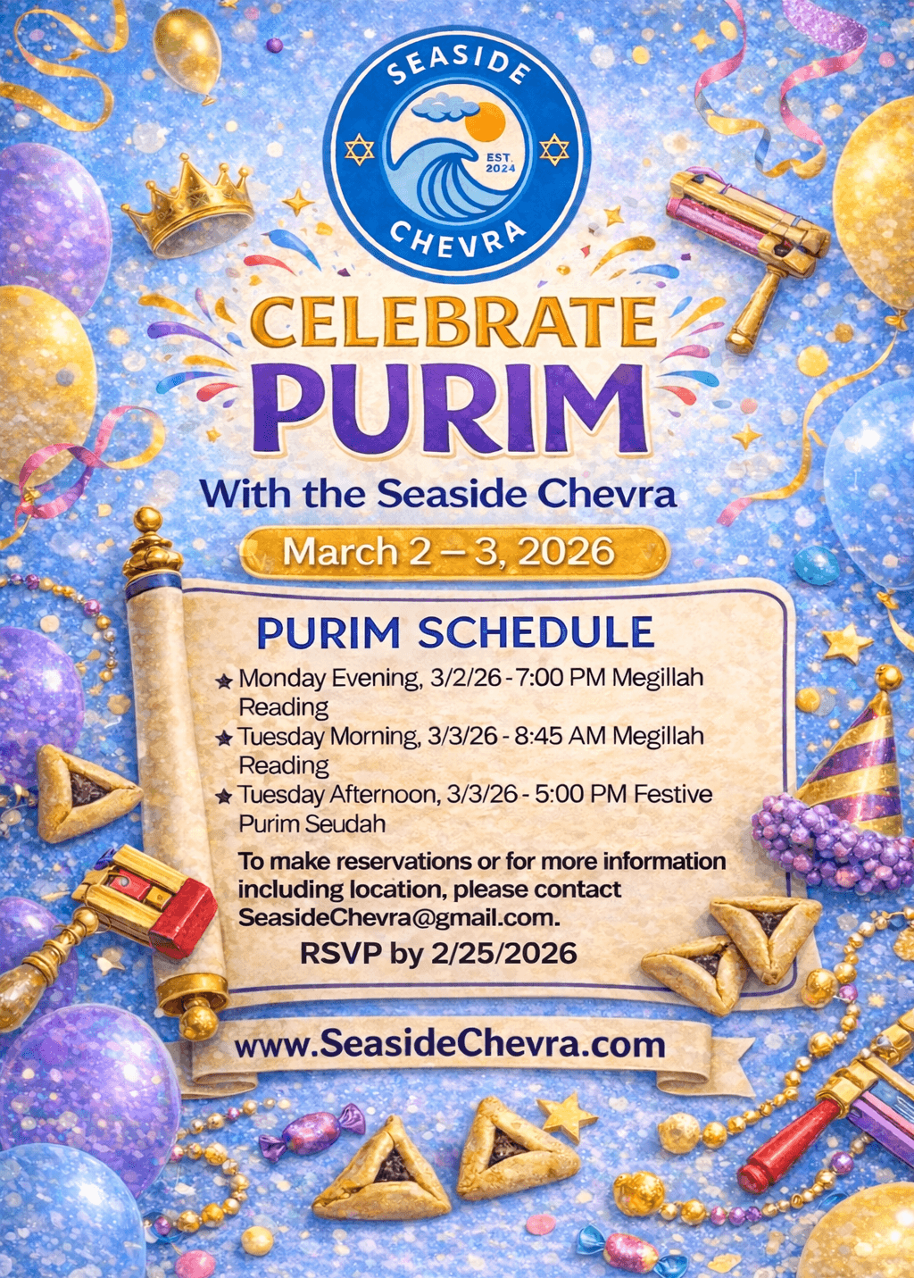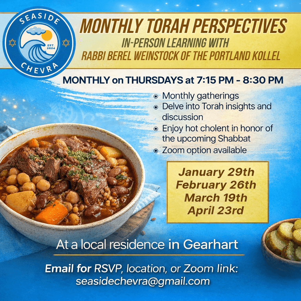 Seaside Chevra is a spirited Jewish community rooted in warmth, caring, and Torah tradition. Whether you're a local, a visitor, or just passing through, we invite you to experience meaningful connection, joyful celebration, and spiritual enrichment in the heart of Seaside.